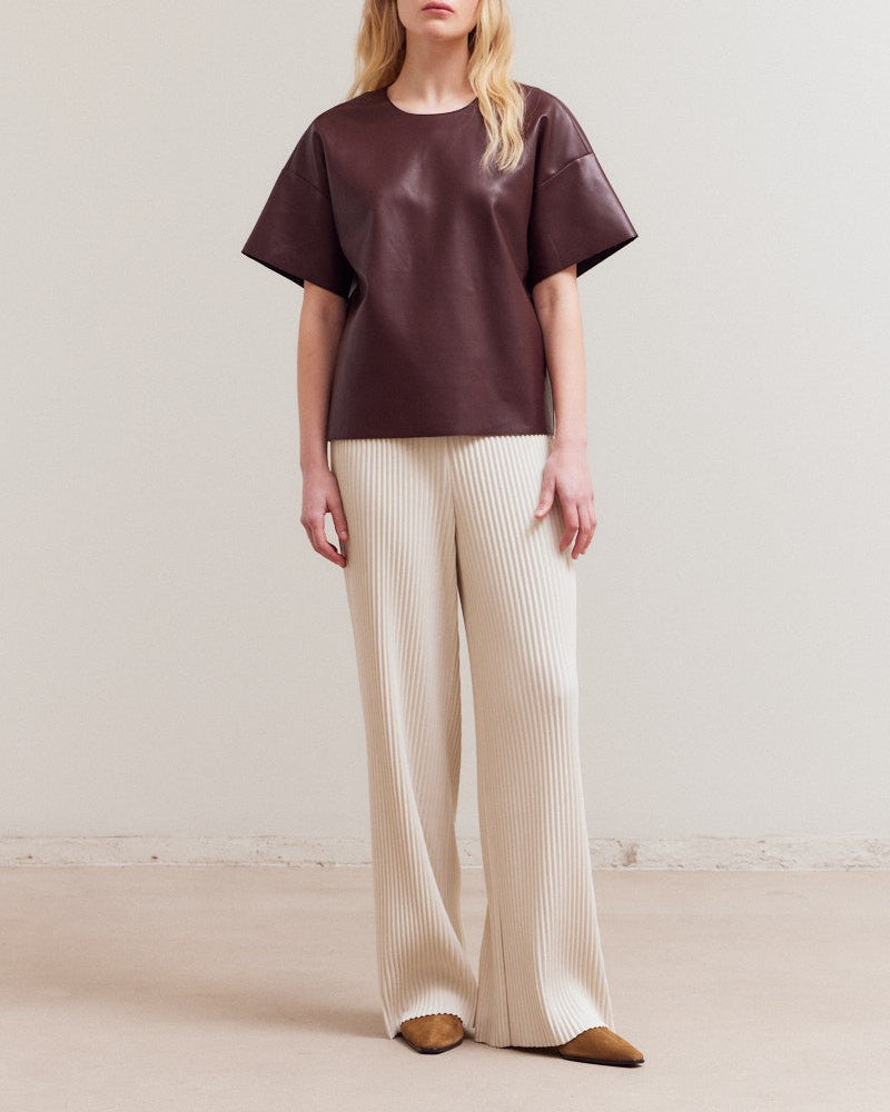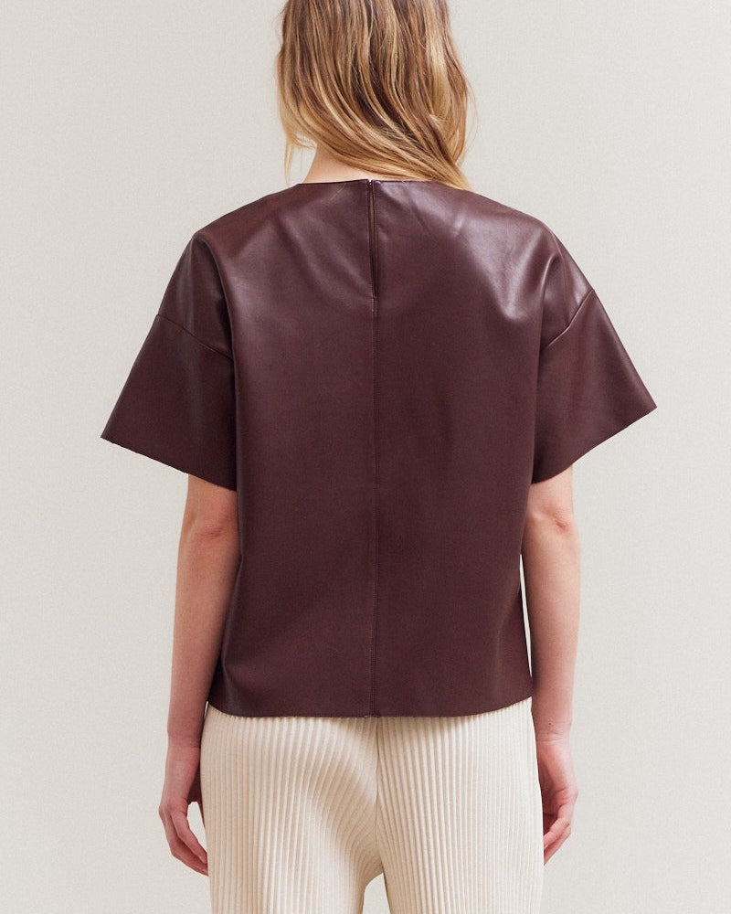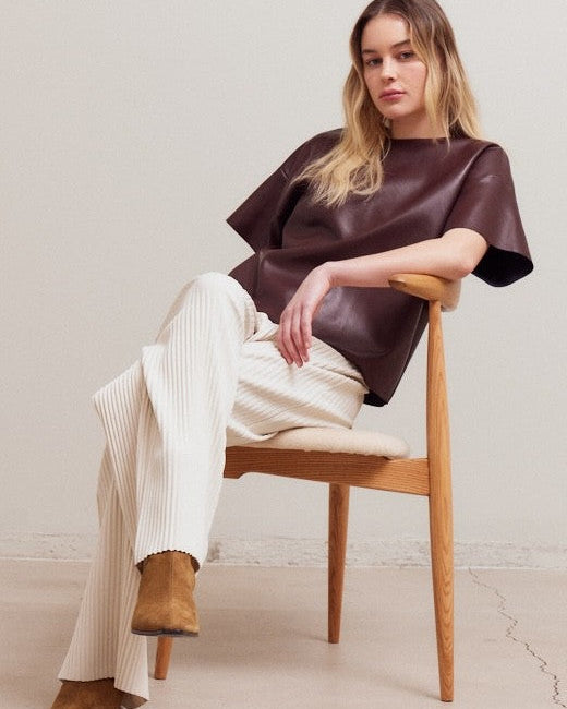 A bold take on a classic silhouette. This vegan leather top in a rich wine hue brings effortless sophistication with a touch of edge. Designed with a relaxed fit and soft, flexible feel — it’s the perfect piece to elevate your denim or pair with trousers for a chic night-out look.