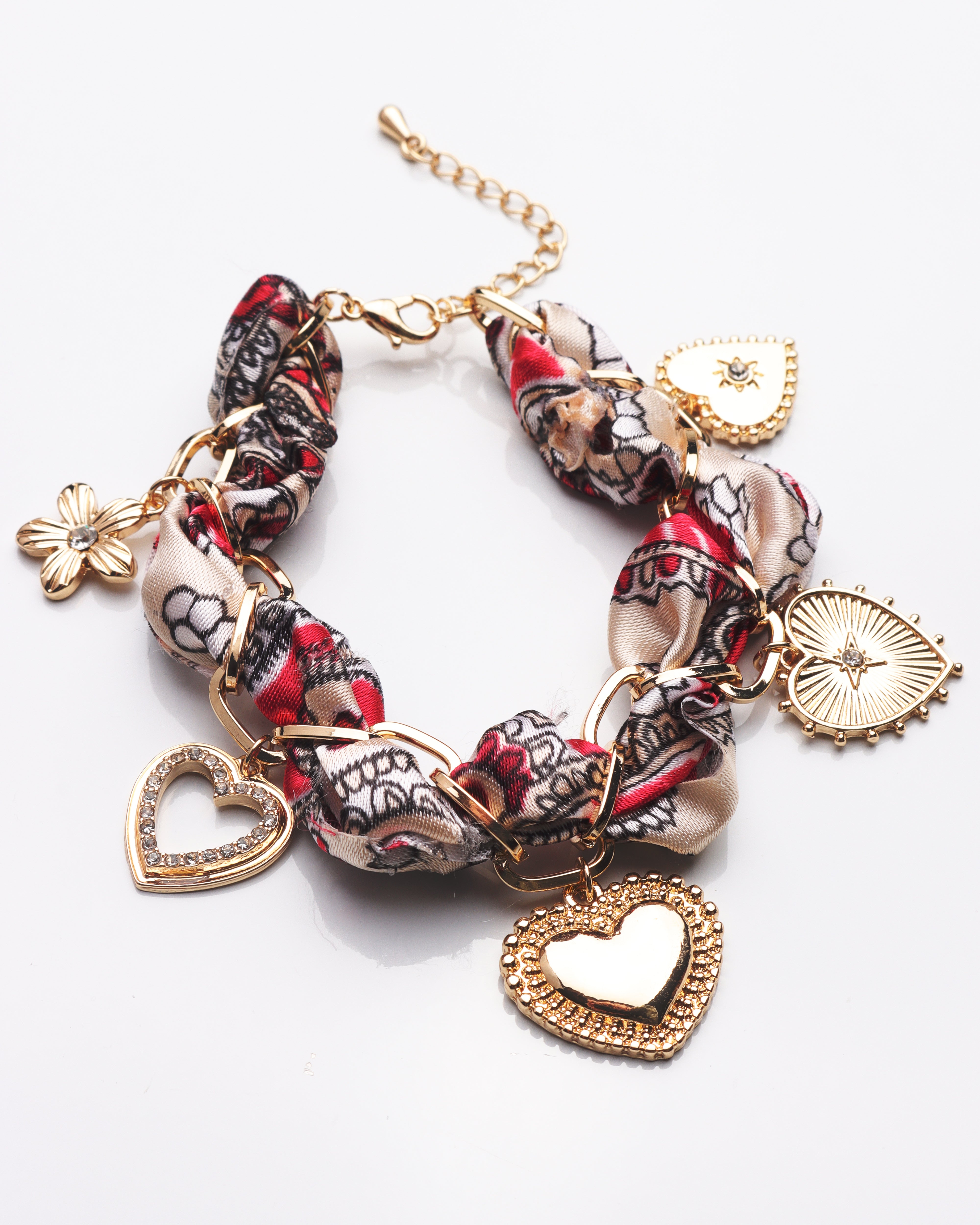 A charming twist on classic elegance, the Petal & Heart Bracelet blends the softness of a red and white scarf-inspired band with the shine of gold accents. Secured with a sleek clasp, this bracelet is detailed with delicate heart and flower charms that add a sweet, feminine touch to any look.