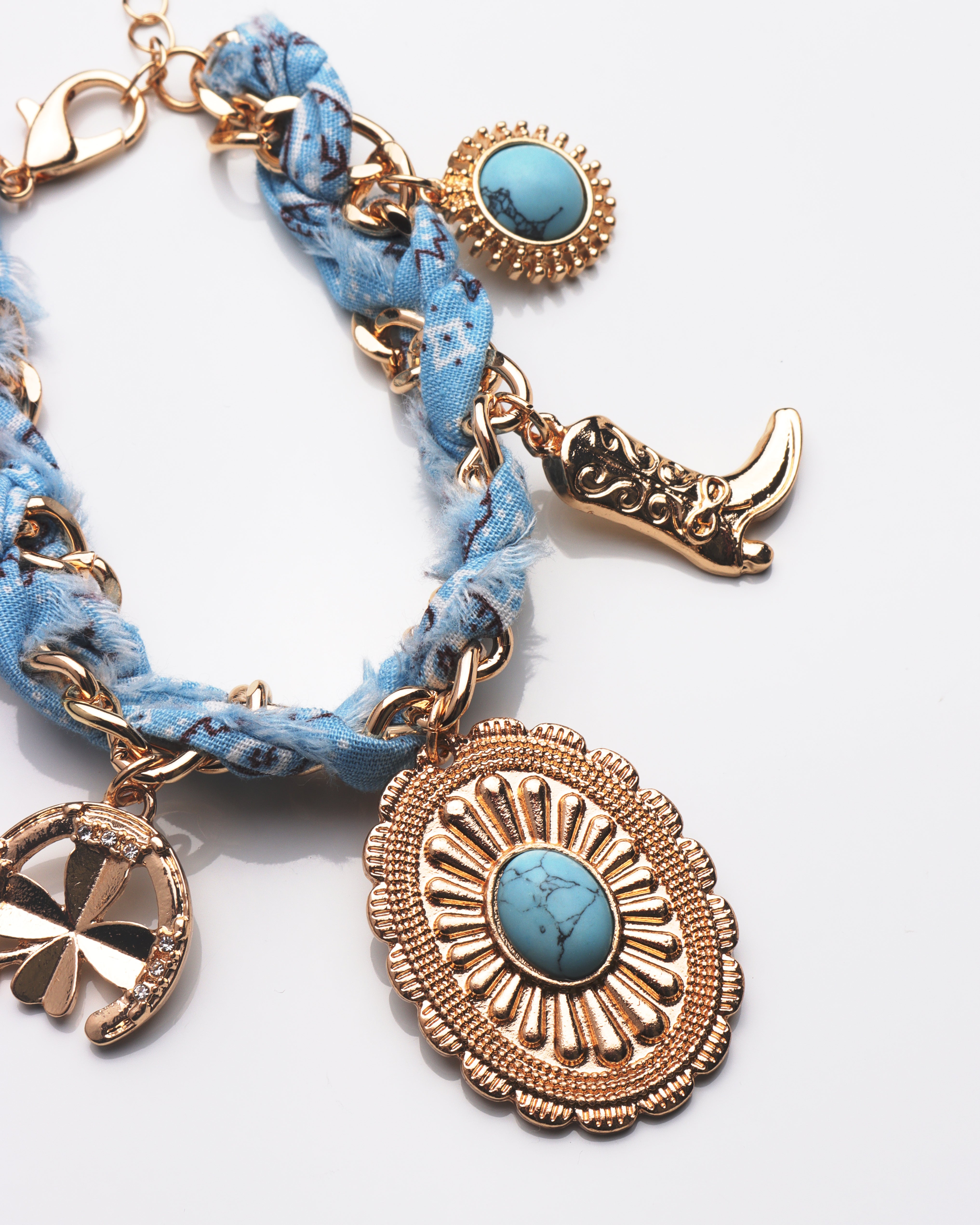 Bright, bold, and dusted with a little Western magic — the Desert Sky Bracelet brings the spirit of the open range to your wrist. Made from turquoise bandana-style fabric and finished with a polished gold clasp, it’s adorned with gold country-inspired charms like stars, boots, hearts, and horseshoes.