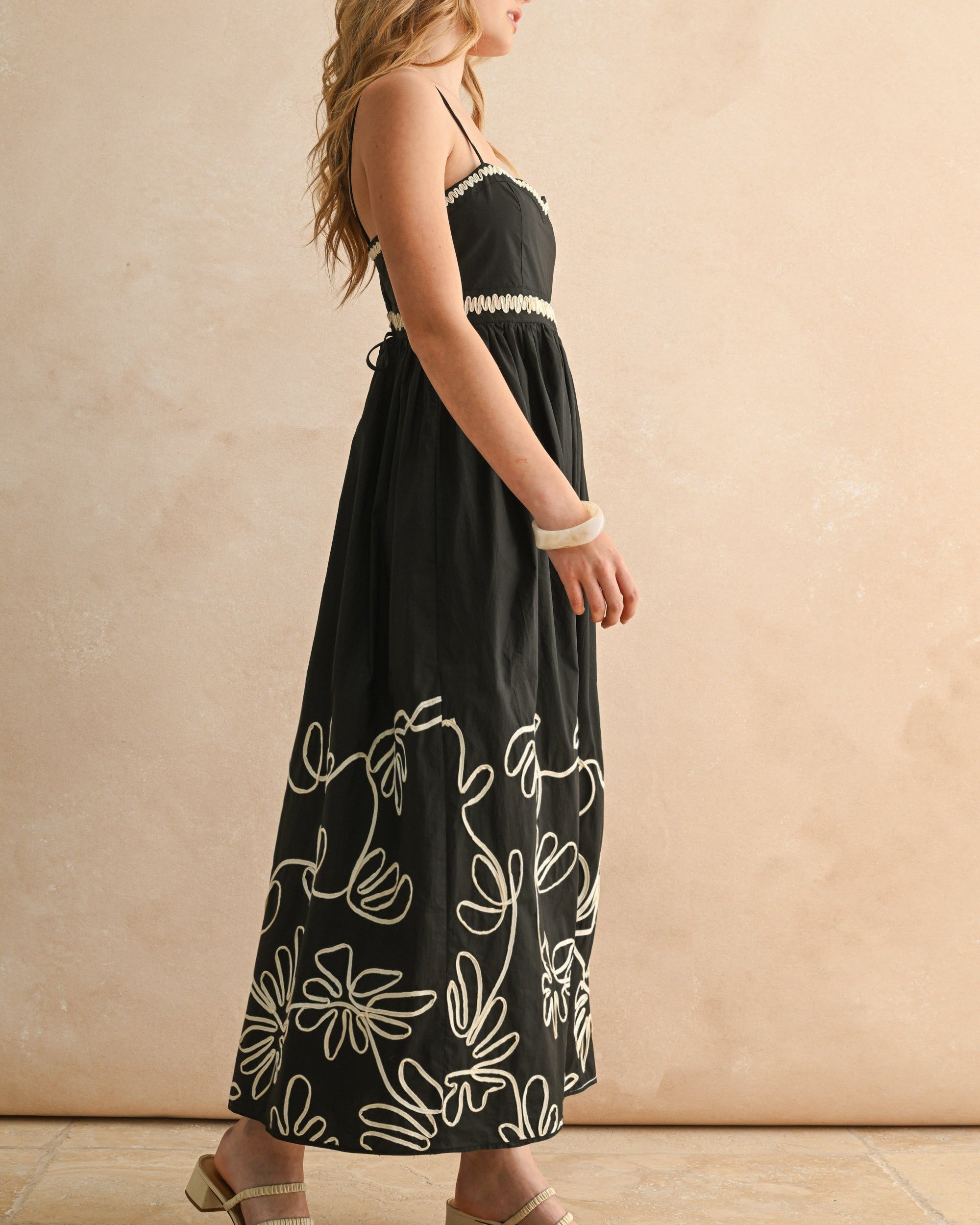 An elegant take on everyday style, this dress combines feminine charm with playful edge. Crafted from 100% cotton, this black midi dress features intricate cream-colored embroidered patchwork in a floral motif and delicate trim at the bust and waist. With adjustable straps and a softly gathered skirt, it’s a flattering, breathable piece for day or night.