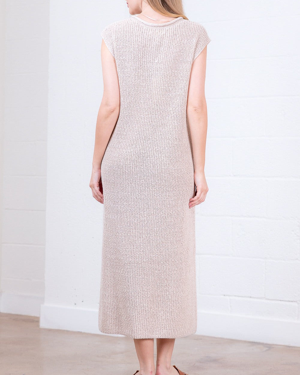 This soft taupe sweater dress features a relaxed fit and a sleek slit neckline that adds subtle interest to its minimalist design. Sleeveless and long in length, it’s the perfect layering piece for cooler days or transitional seasons, offering both warmth and style in one easy-to-wear silhouette.