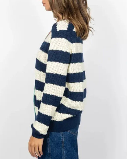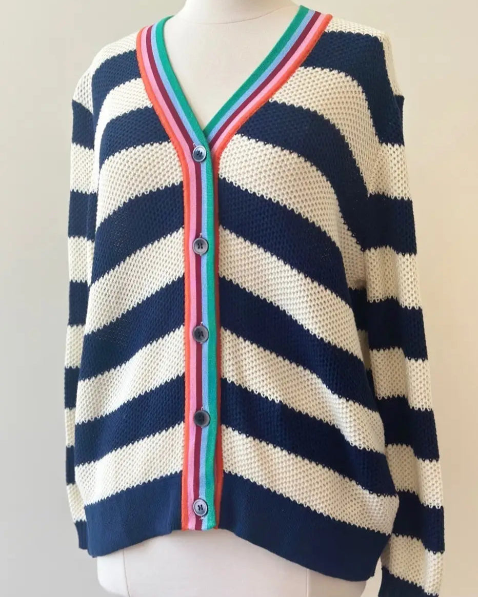 A fresh twist on a classic, the Cape Cardigan features timeless blue and white stripes accented with a playful pop-of-color center edging. The striped detailing along the center includes pink, purple, green, and orange, adding a fun, unexpected touch to this cozy sweater. Perfect for layering or wearing on its own for a vibrant, casual look.