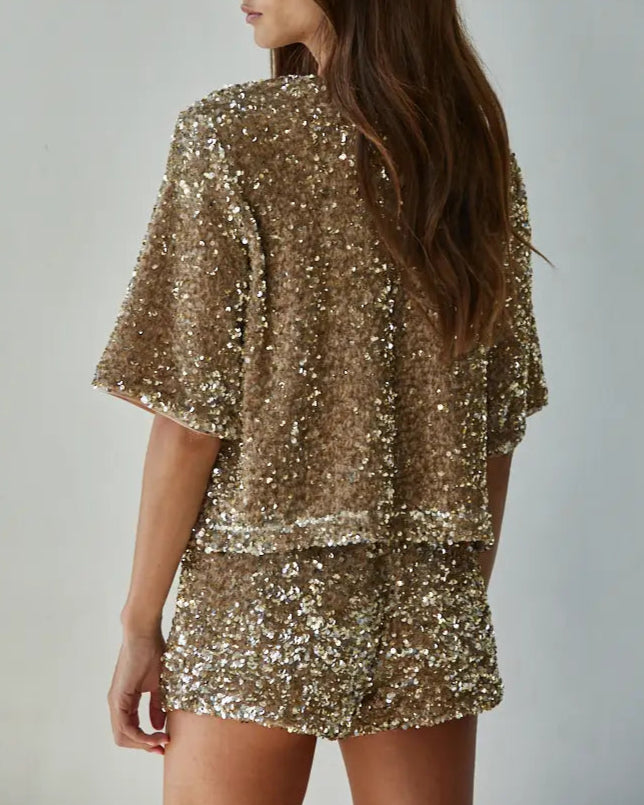 Shine bright in this Sequin Round Neck Top, designed with short sleeves and a flattering round neckline. Crafted from a woven polyester-spandex blend, it features a shimmering sequin overlay with a soft lining for comfort. A back keyhole detail adds a touch of elegance, making it perfect for nights out or special occasions.
